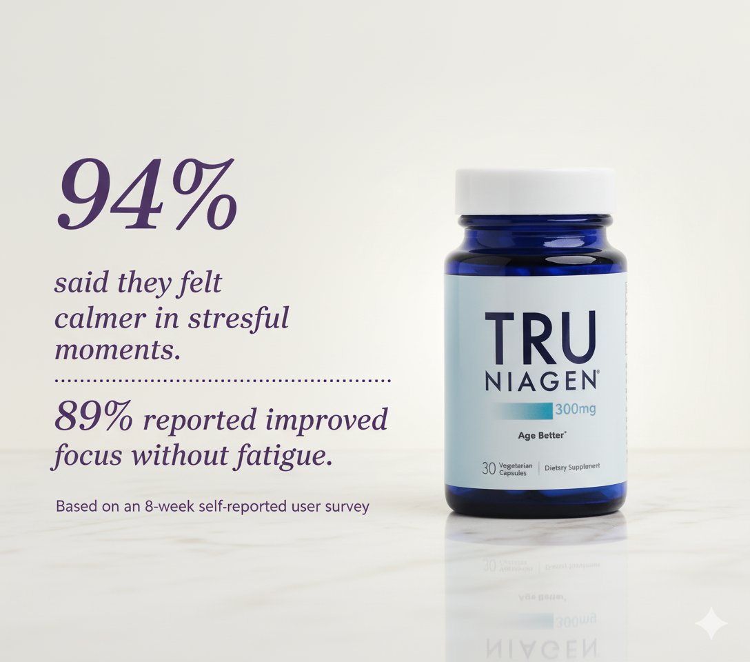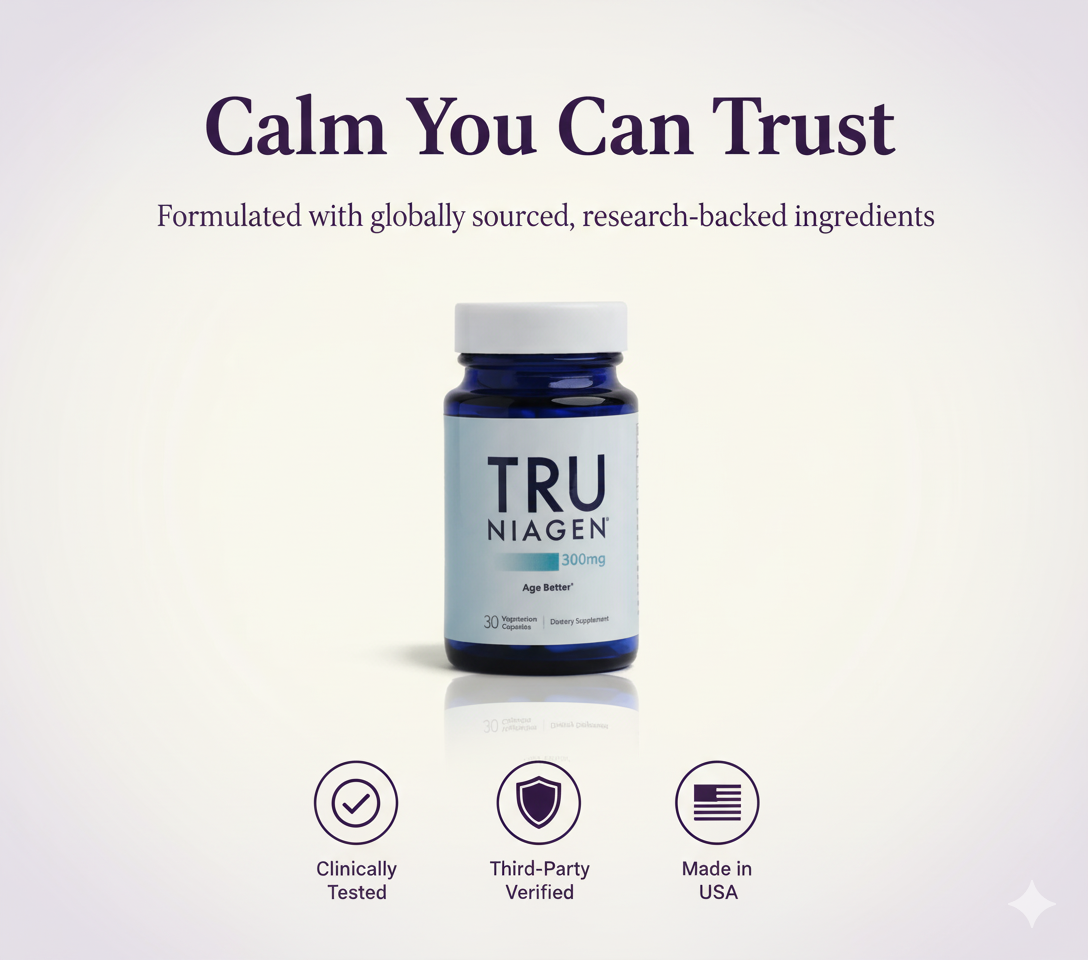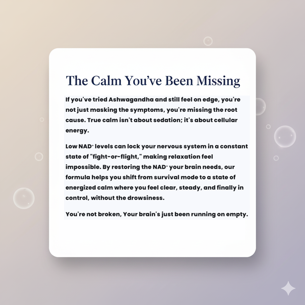 True, lasting calm is regulated by your body's energy. When your critical NAD⁺ levels decline with age or stress, your brain can no longer manage stress signals effectively. Your nervous system gets locked in a constant 'fight-or-flight' mode, even when you’re perfectly safe.