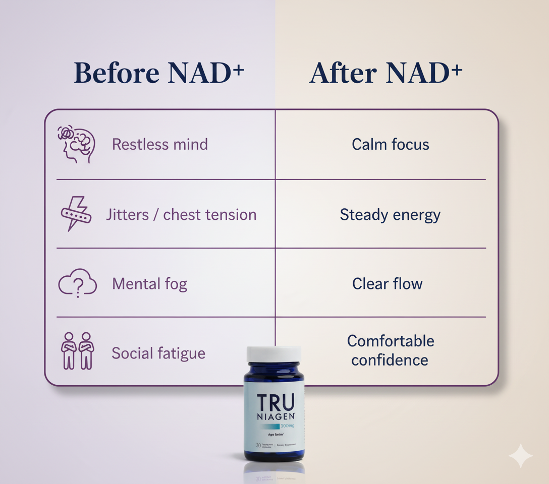 Ever feel like your body goes into high alert in a completely normal social setting? That physical tension, restless energy, and racing heart isn't just "in your head." It's your nervous system getting stuck in a "fight or flight" response, a state that consumes immense cellular resources. NAD+ is a fundamental coenzyme for nervous system health and energy production. By supporting your body at a foundational level, Tru Niagen helps promote a state of neurological balance, allowing you to feel more grounded, physically relaxed, and in control of your own skin.